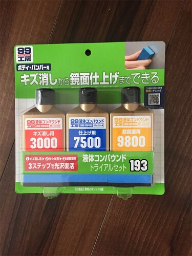 んちゃ 前回へこみ修理した時に塗装がおかしかったので修正もかねて仕上げをしてみました。 修正塗装後の仕上げ! ソフト99さんの液体コンパウンドトライアルセット 仕上げ前 1000番耐水ペーパー キズ消し用コンパウンド 仕上げ用コンパウンド 超鏡面用コン…